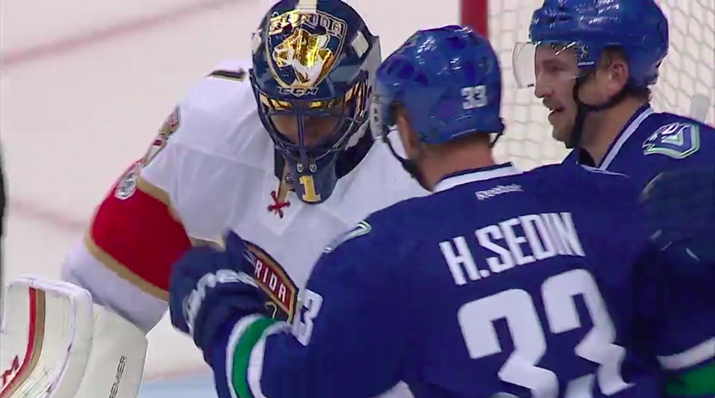 Luongo se připojil ke gratulantům, přestože stál na opačné straně barikády. Doslova řečeno. Právě jeho Sedin prostřelil, a získal tak jubilejní bod.