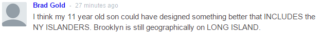 Robert NovotnýJe již potvrzeným faktem, že domovem New Yorku Islanders bude od příští sezóny Brooklyn a nápis „Home of the New York Islanders“ se přesune na zeď arény s názvem Barclays Center. S novou arénou však přichází i první starosti. Konkrétně je řeč o tom, že zástupci Barclays Center navrhli vedení Islanders nové alternativní logo a usilují o jeho realizaci v příští sezóně s tím, že by se objevilo na třetí sadě dresů. Nutno podotknout, že tým již při vyjednávání o přesunu jasně prohlásil, že se název ani hlavní logo nezmění, proto padl tento návrh. Nápis „Brooklyn Hockey“, který by se měl na navrhnutém logu objevit, však nesklidil u fanoušků příliš dobré ohlasy, naopak, pro příznivce Isles je tento návrh ve většině případů nepřípustný. Zatím není nic potvrzeno a situace je ve stádiu vyjednávání.