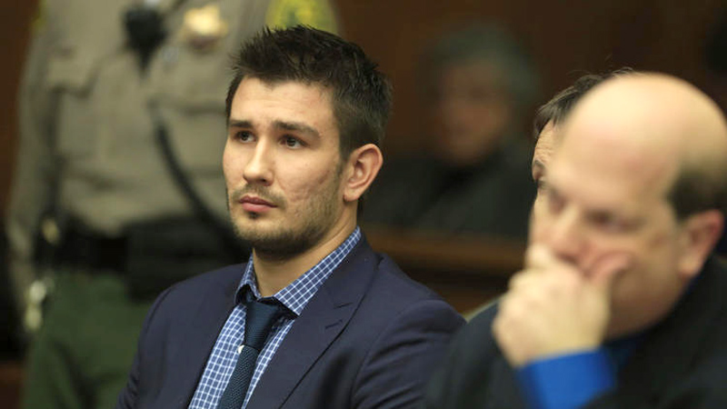 Reportér Los Angeles Times Nathan Fenno zahlédl Vojnova v soudní síni ve středu během předběžného řízení. Přišel o berlích, nohu měl v sádře, a dostavil se v doprovodu své manželky, Marty Varlamové.