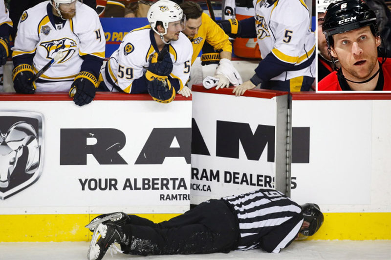 Proč? Protože jeho rozhodnutí musí být z právnického hlediska nenapadnutelné. Pakliže zamítne Widemanovo odvolání do výše trestu (zákaz činnosti na dvacet zápasů za útok na čárového rozhodčího Rona Hendersona - viz snímek), může se hráč, s pomoci hráčských odborů NHLPA, odvolat. Případ bude posuzovat nezávislý arbitrator James Oldham.
