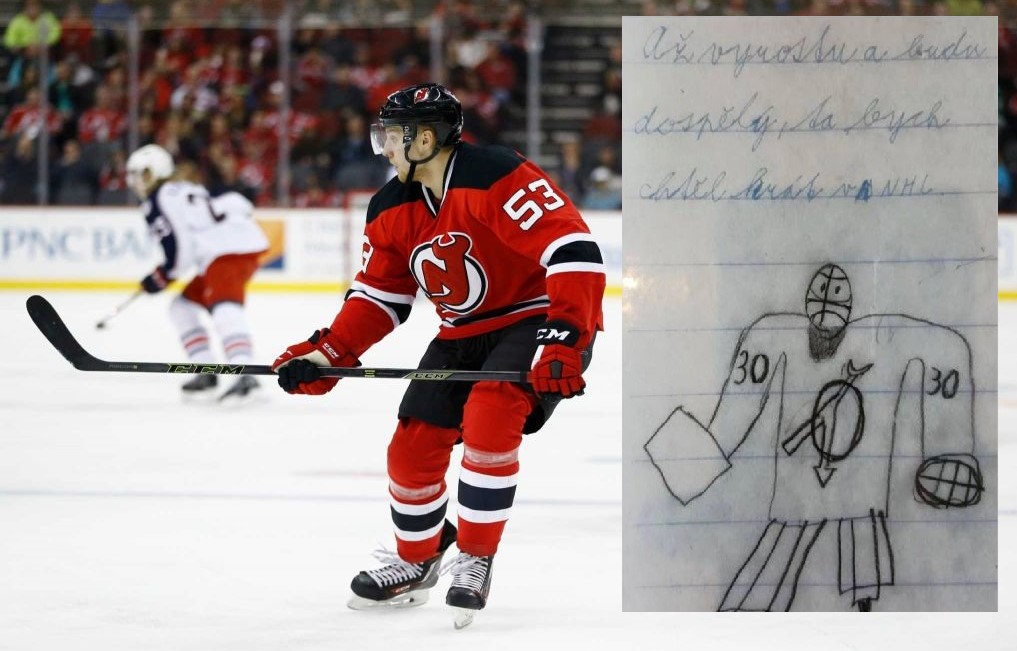 „Až vyrostu a budu dospělý, tak bych chtěl hrát v NHL.“ Vyznání malého Vojtěcha Mozíka, které kdysi odevzdal učitelce na základní škole, doplněné o kresbu brankářské legendy Martina Brodeura, se v posledních dnech stalo věcí veřejnou. To proto, že šampion extraligy z roku 2013 svůj sen na rozdíl od spousty jiných skutečně dotáhl. Je dospělý a hraje NHL. „Fakt jsem to kreslil já, přišla s tím mamka. Než jsem na začátku sezony odlétal na kemp, dala mi tenhle obrázek zarámovaný,“ líčí nováček přesně v tom dresu, který kdysi zvěčnil na linkovaný papír.