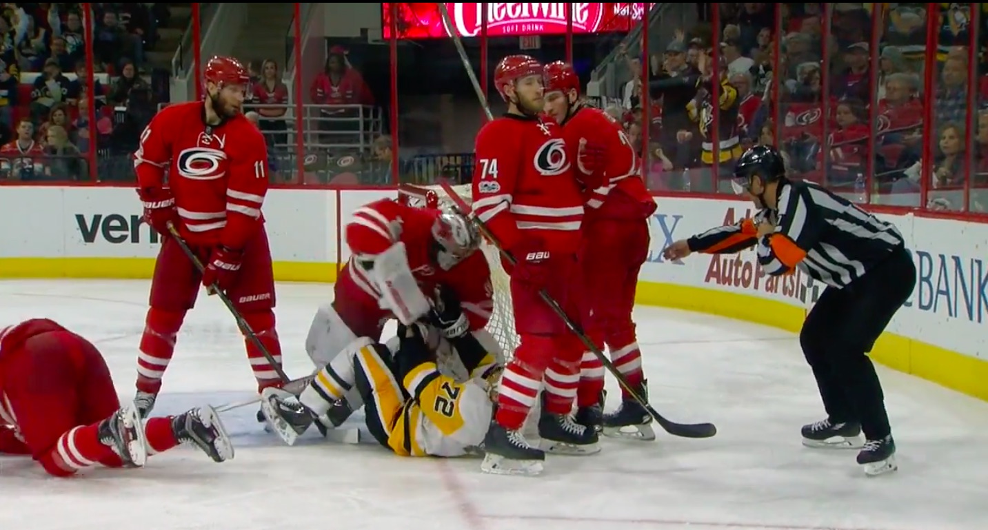 Nepřehledná situace na brankovišti, při které si Ward myslí, že drží kotouč, ale Hornqvist se po něm vrhne a po střetu s obráncem padá k Wardovi. Sudí už mezitím ukazuje na branku. Gól. Brankáři Caroliny se ale počínání švédského soupeře vůbec nelíbí a vrhne se na na zádech ležícího soka a nekompromistě jej udeří vyrážečkou do obličeje.